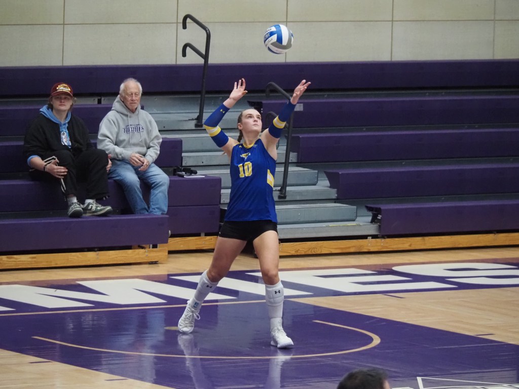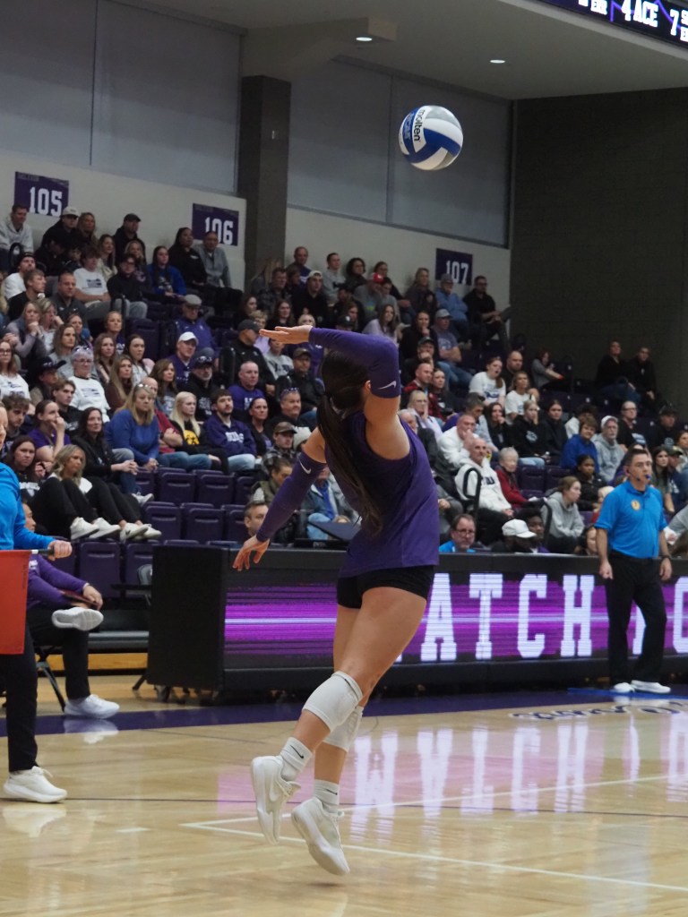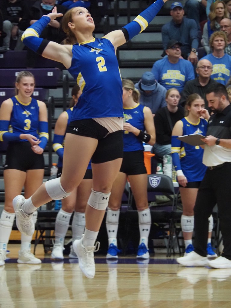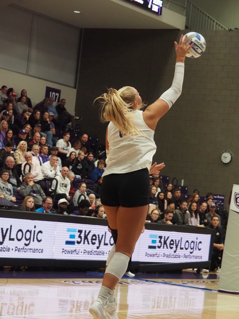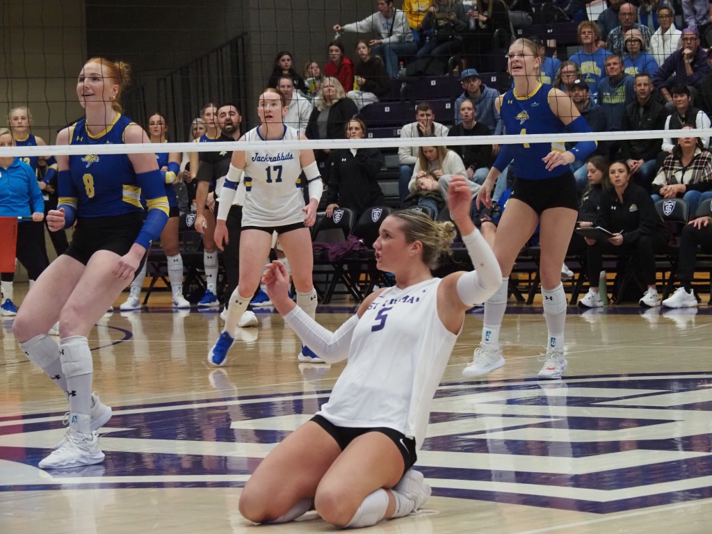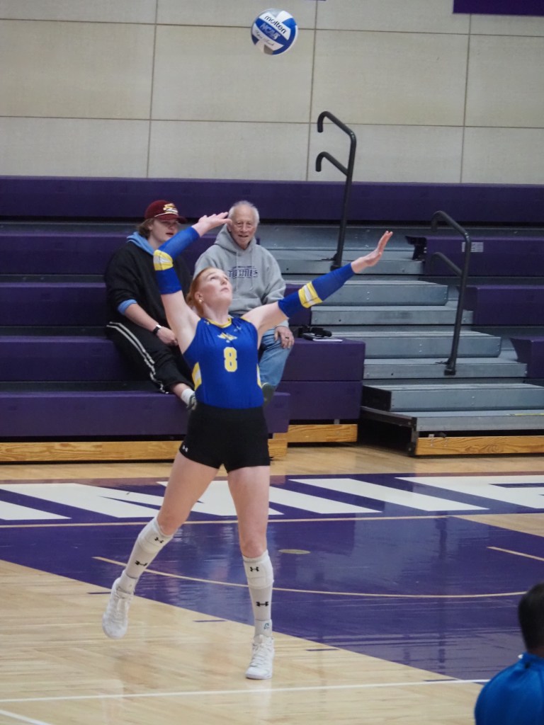 SDSU’s Madison Burr (#8) seemingly hovering in mid air while waiting the ball.