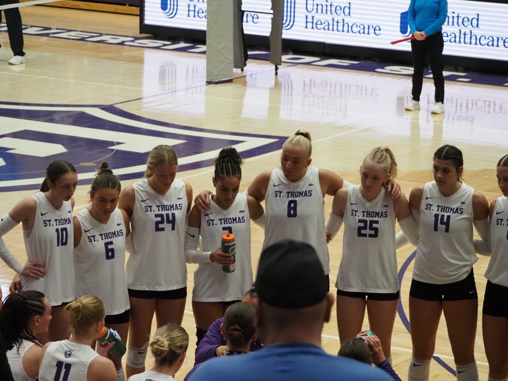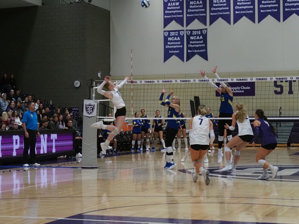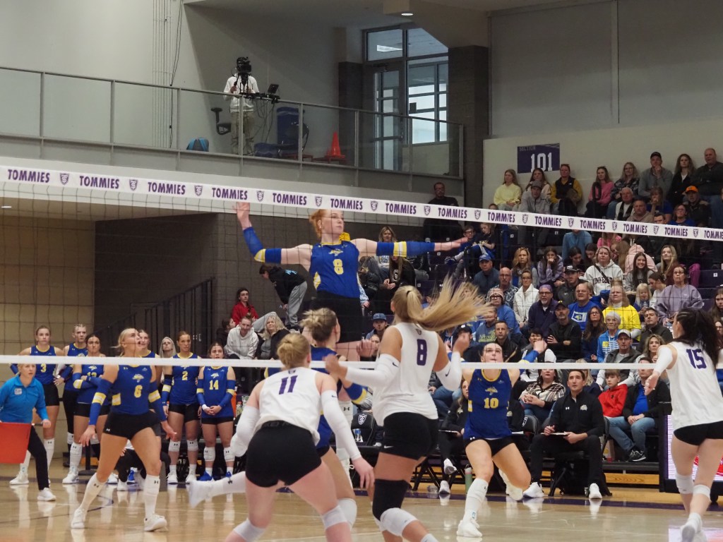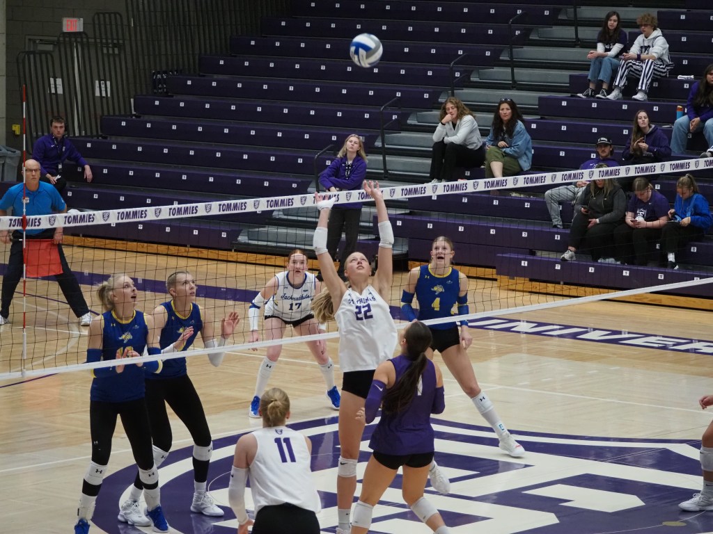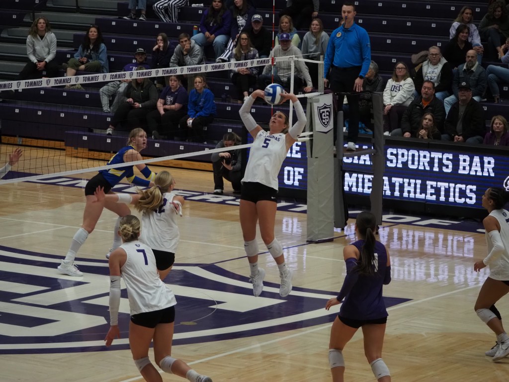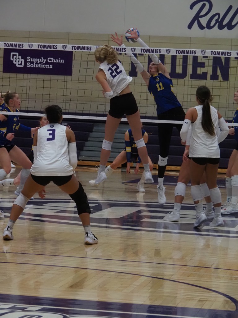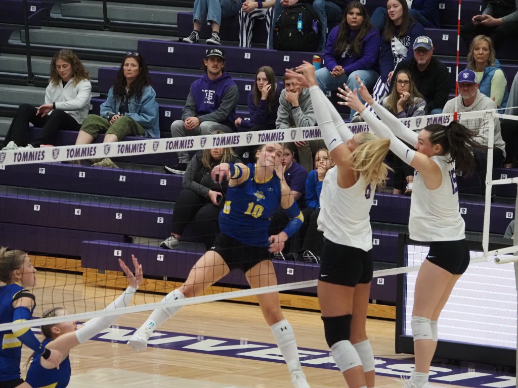 Tommie’s Megan Wetter (#8) and Tezra Rudzitis (#15) are ready for the block from SDSU’s Sylvie Zgonc (#10).