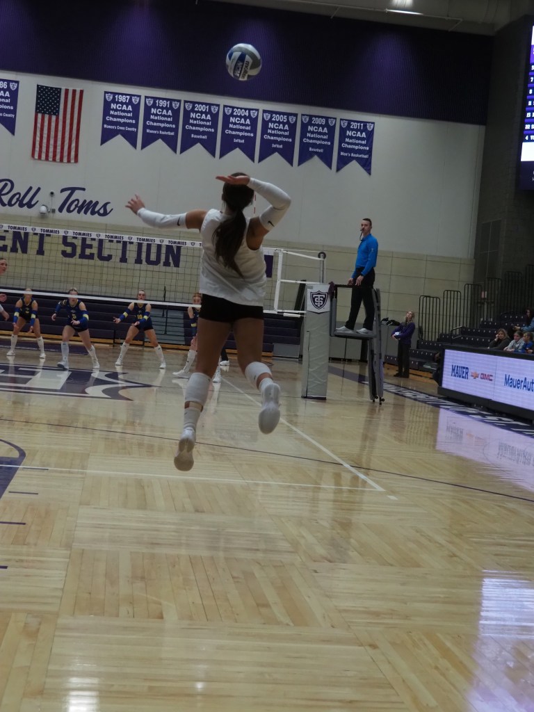 (Left) Tommie Addie Schmotzer (#22) blows a shot past SDSU’s Sydni Schenan (#11). (Right) Tommie Anya Schmidt winds up for the kill.