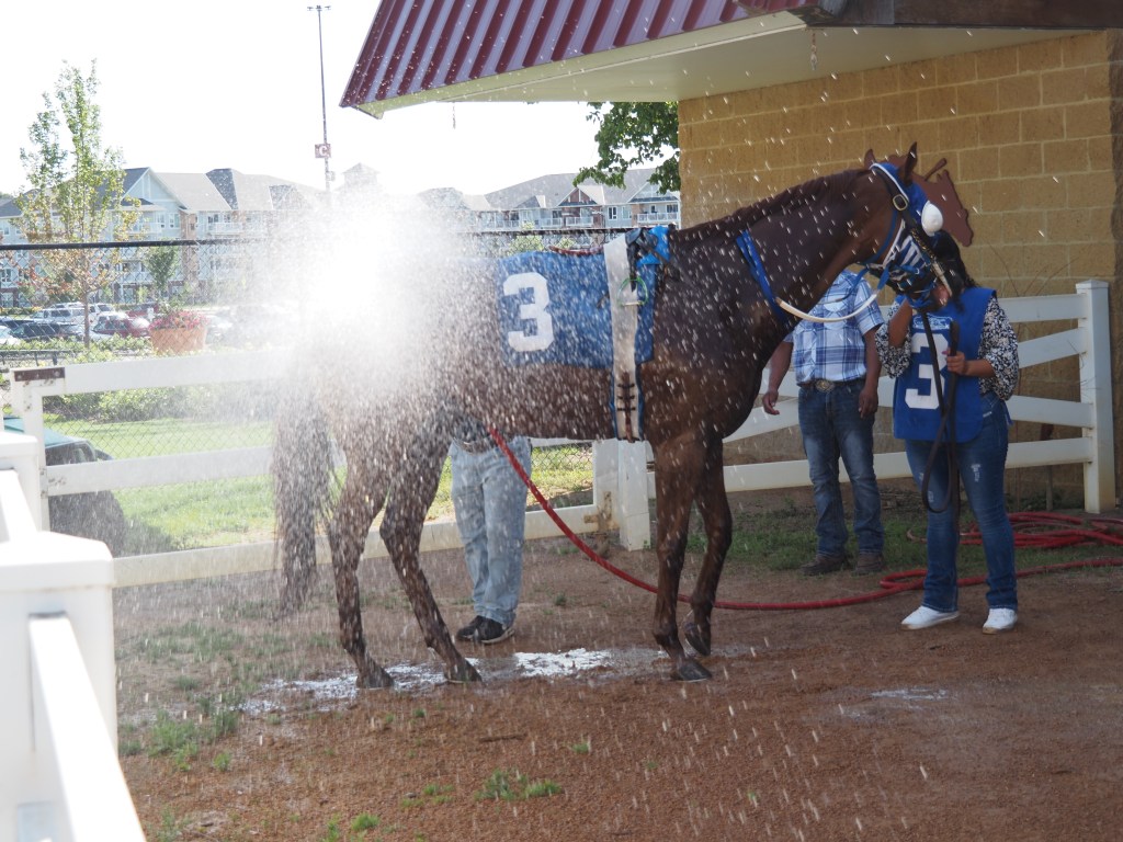 Forsaken enjoys a pre-race bath in the paddocks prior to Race 1. Nothing makes a 6 Furlong Claiming N3L race more enjoyable than a bath!