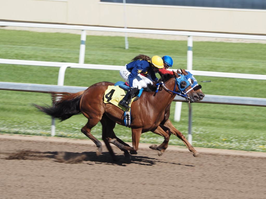 Forsaken (Eduardo Gallardo) and Lemon Meringue (Kelsi Harr) race to the wire in Race 1.